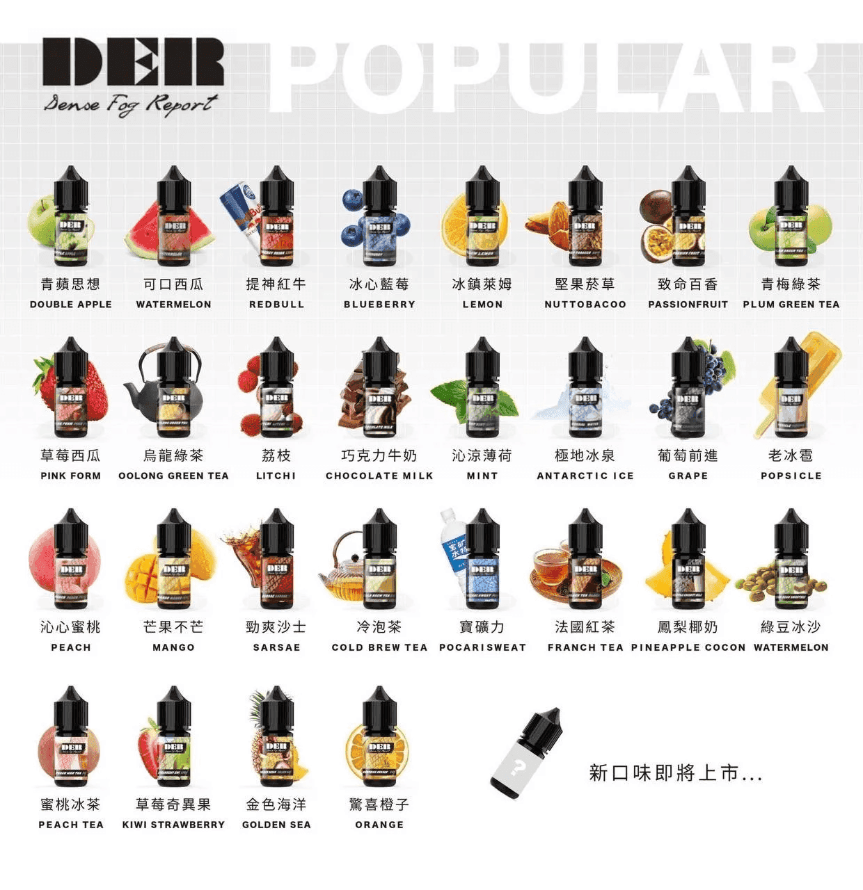 | 口味 | 青蘋思想, 可口西瓜, 提神红牛, 冰心藍莓, 冰鎮莱姆, 堅果菸草, 致命百香, 青梅綠茶, 草莓西瓜, 烏龍缘茶, 荔枝, 巧克力牛奶, 沁凉薄荷, 極地冰泉, 葡葡前進, 老冰棍, 沁心蜜桃, 芒果不芒, 勁爽沙士, 冷泡茶, 寶礦力, 法國红茶, 鳳梨椰奶, 綠豆冰沙 |